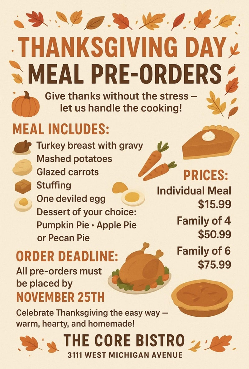 We’ve rounded up the menus for local spots offering baked goods, sides and full meals for Thanksgiving in Kalamazoo.